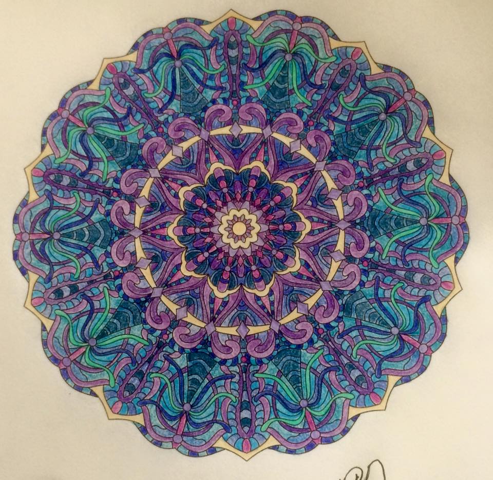 I recently picked up on the “grown-up” coloring book fad and bought a couple of books and seventy-two art pencils. Hey, I do nothing in a low-key way. One book is called Balance: Angie’s Extreme Stress Menders, Volume 1 by Angie Grace. It’s a book of mandalas, uncolored, so you can, well, color them. I didn’t have extreme stress, only the mild stress of a re-write not going the way I expected and the last-minute details of planning and putting on a one-day writers symposium. Okay, that had begun to border on extreme stress.